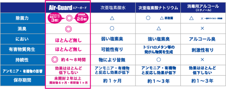安定化二酸化塩素は、次亜塩素ナトリウムなどの塩素系の化合物と比較し、2.6~3倍という除菌力を有しています。